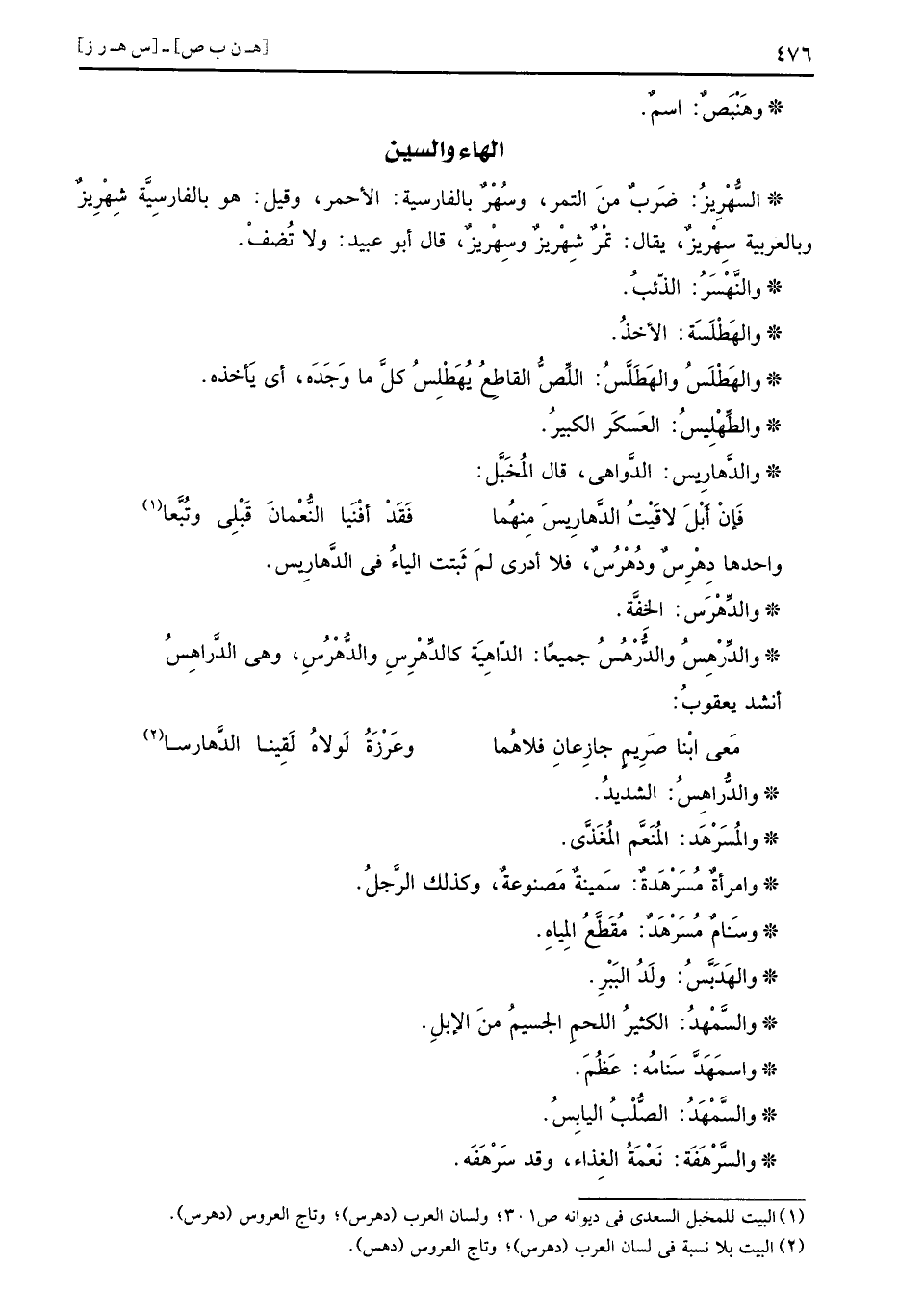 وَاحِدهَا دِهْرِسٌ ودُهْرُسٌ، فَلَا أَدْرِي لم ثبتَتْ الْيَاء فِي الدَّهارِيس.