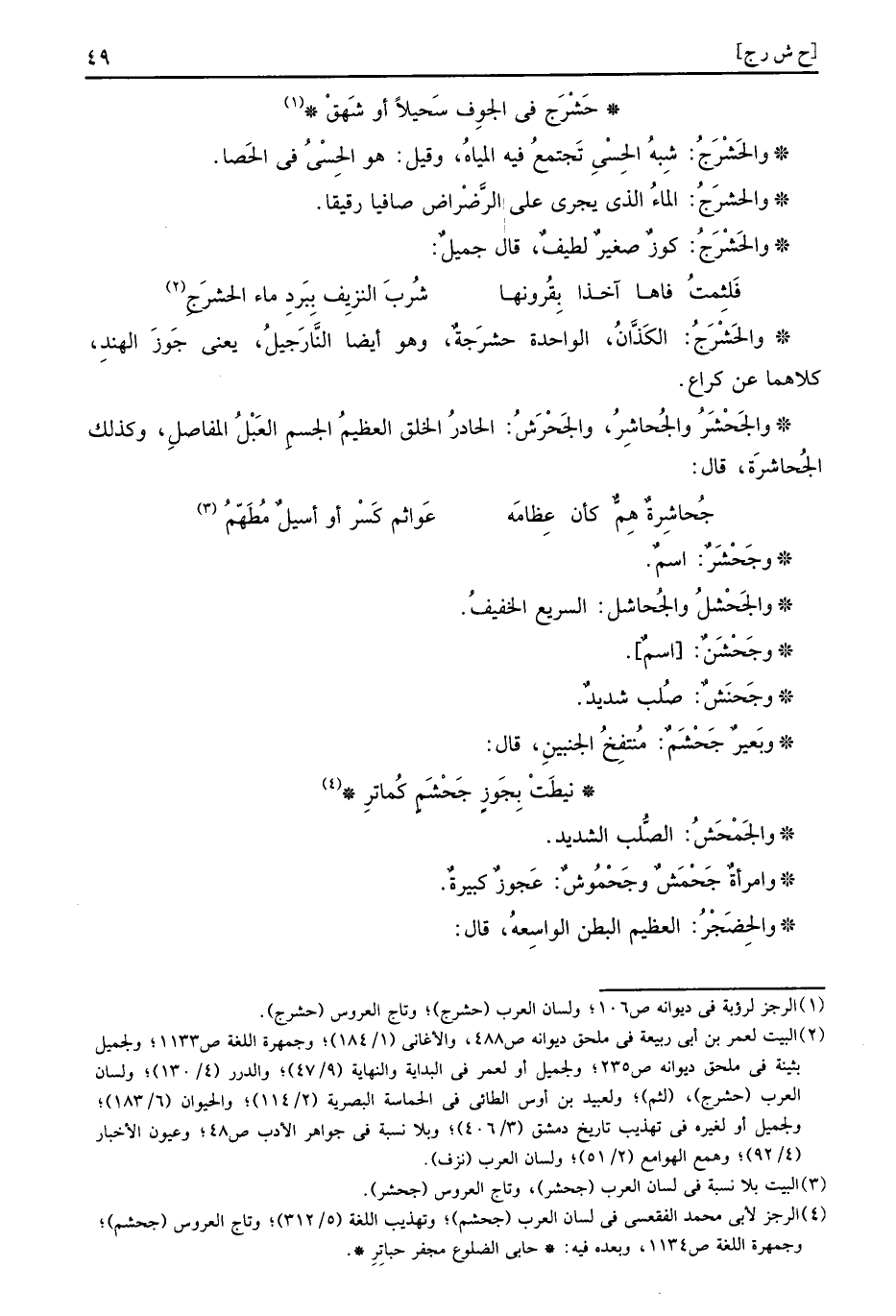 والجَحْشَرُ والجُحاشِرُ، والجَحْرَشُ: الحادر الْخلق الْعَظِيم الْجِسْم العبل المفاصل، وَكَذَلِكَ الجُحاشرة، قَالَ: