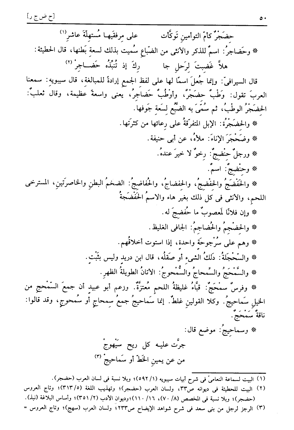 قَالَ السيرافي: وَإِنَّمَا جعل اسْما لَهَا على لفظ الْجمع إِرَادَة للْمُبَالَغَة، قَالَ سِيبَوَيْهٍ: سمعنَا الْعَرَب تَقول: وطب حِضَجْرٌ، وأوطب حضاجر، يَعْنِي وَاسِعَة عَظِيمَة، وَقَالَ ثَعْلَب: الحِضَجْرُ الوطب، ثمَّ سمى بِهِ الضبع سَعَة جوفها.
