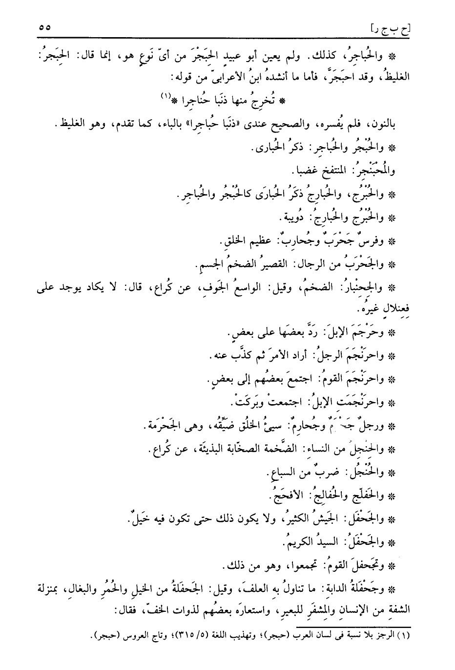والحُباجِرُ، كَذَلِك. وَلم يعين أَبُو عبيد الحِبَجْرُ من أَي نوع هُوَ، إِنَّمَا قَالَ: الحِبَجرُ: الغليظ، وَقد احبَجَرَّ، فَأَما مَا أنْشدهُ ابْن الْأَعرَابِي من قَوْله: