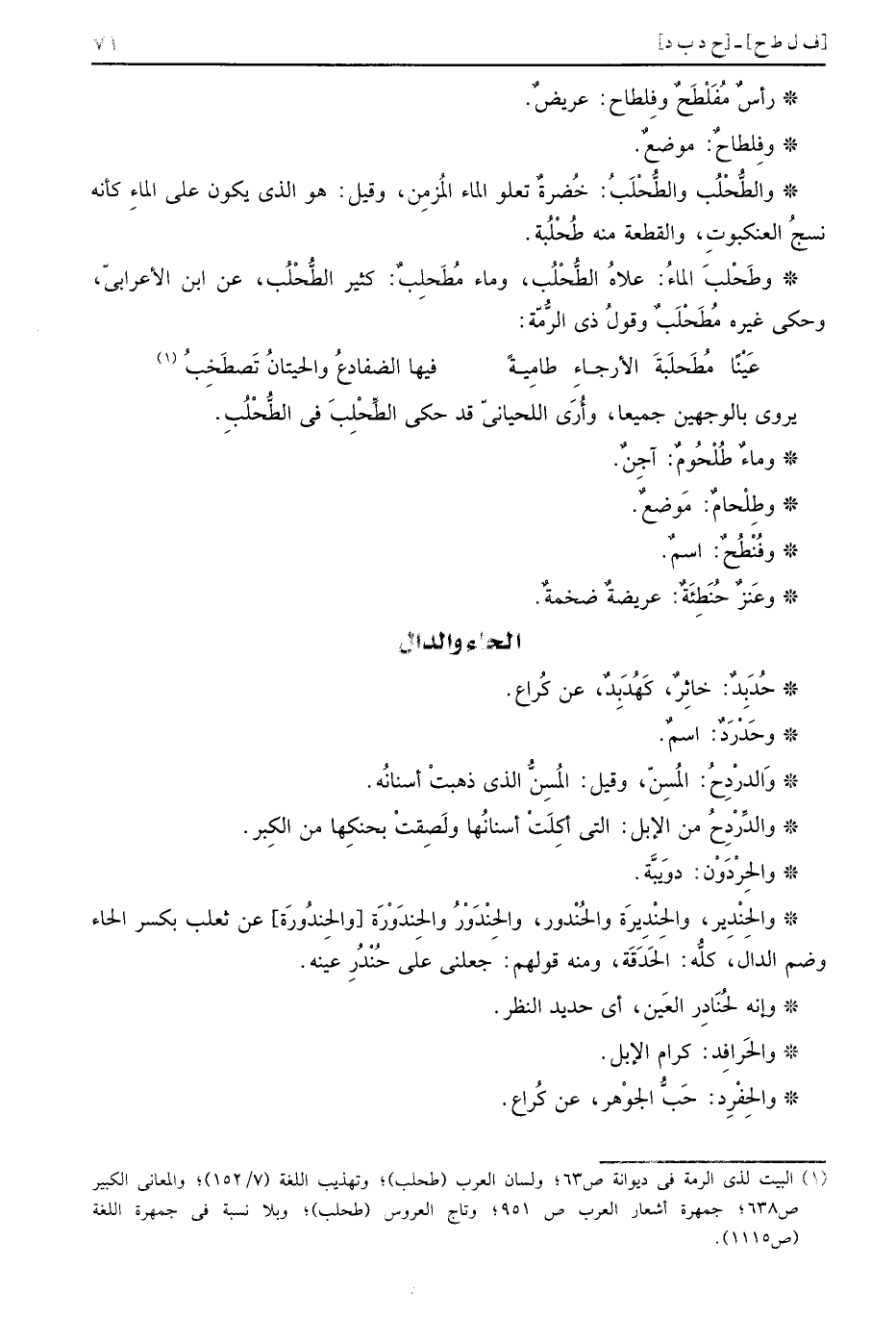 وطَحْلبَ المَاء: علاهُ الطُّحْلُب، وَمَاء مُطَحلِبٌ: كثير الطُّحْلُب، عَن ابْن الْأَعرَابِي، وَحكى غَيره مُطَحْلَبٌ وَقَول ذِي الرمة: