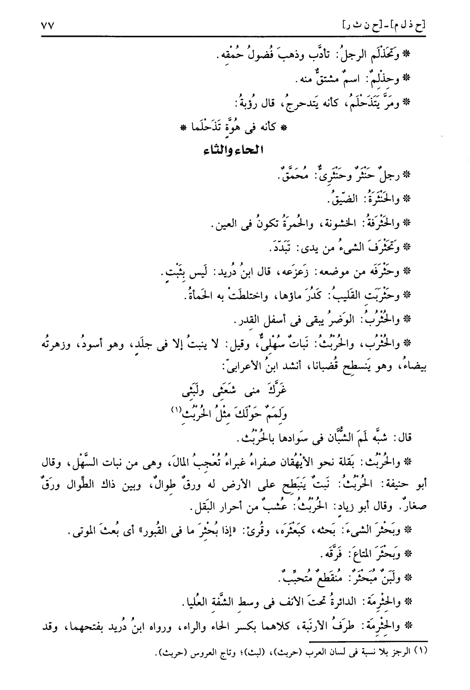 والحُثرُب، والحُرْبُثُ: نَبَات سهلي، وَقيل: لَا ينْبت إِلَّا فِي جلد، وَهُوَ أسود، وزهرته بَيْضَاء، وَهُوَ ينسطح قضبانا، أنْشد ابْن الْأَعرَابِي: