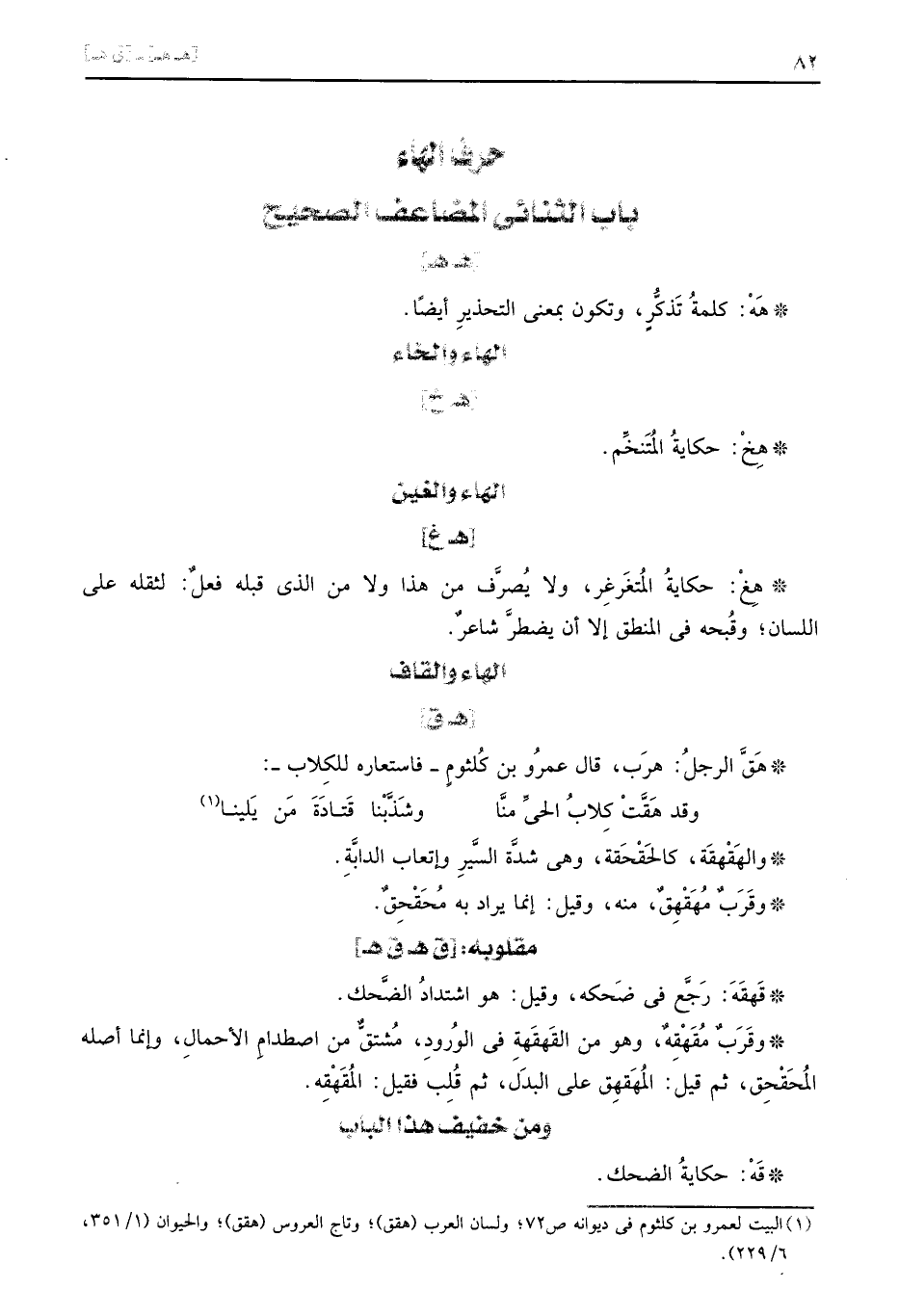 وقَرَبٌ مُقَهْقِهٌ، وَهُوَ من القهقهة فِي الْوُرُود، مُشْتَقّ من اصطدام الْأَحْمَال، وَإِنَّمَا أَصله المُحَقْحِق، ثمَّ قيل: المُهَقهِق على الْبَدَل، ثمَّ قلب فَقيل: المُقَهْقِه.