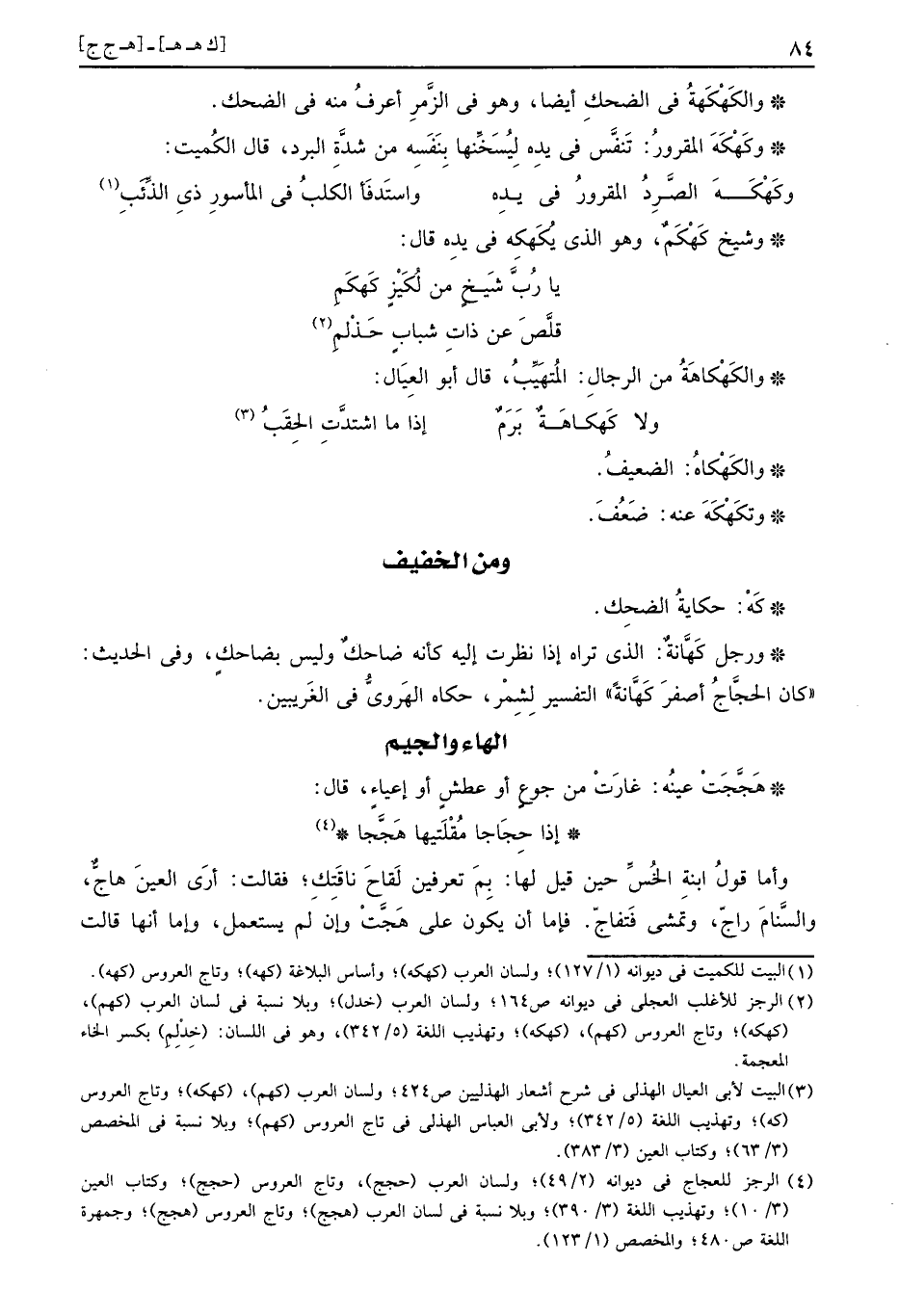 وكَهْكَهَ المقرور: تنفس فِي يَده ليسخنها بِنَفسِهِ من شدَّة الْبرد، قَالَ الْكُمَيْت: