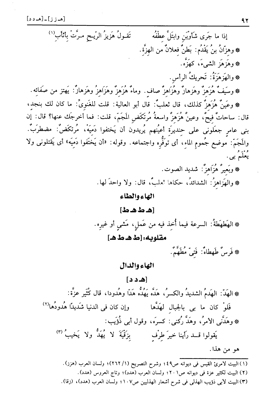 وَعين هُزَهِزٌ كَذَلِك، قَالَ ثَعْلَب: قَالَ أَبُو الْعَالِيَة: قلت للغنوي: مَا كَانَ لَك بِنَجْد، قَالَ: ساحات فيح، وَعين هُزَهِزٌ وَاسِعَة مرتكض المجم، قلت: فَمَا أخرجك عَنْهَا؟ قَالَ: إِن بني عَامر جعلوني على حنديرة أَعينهم يُرِيدُونَ أَن يختفوا دميه، مرتكض: مُضْطَرب. والمجم: مَوضِع جموم المَاء، أَي توفره واجتماعه. وَقَوله: " أَن يختفوا دميه " أَي يقلوني وَلَا يعلم بِي.