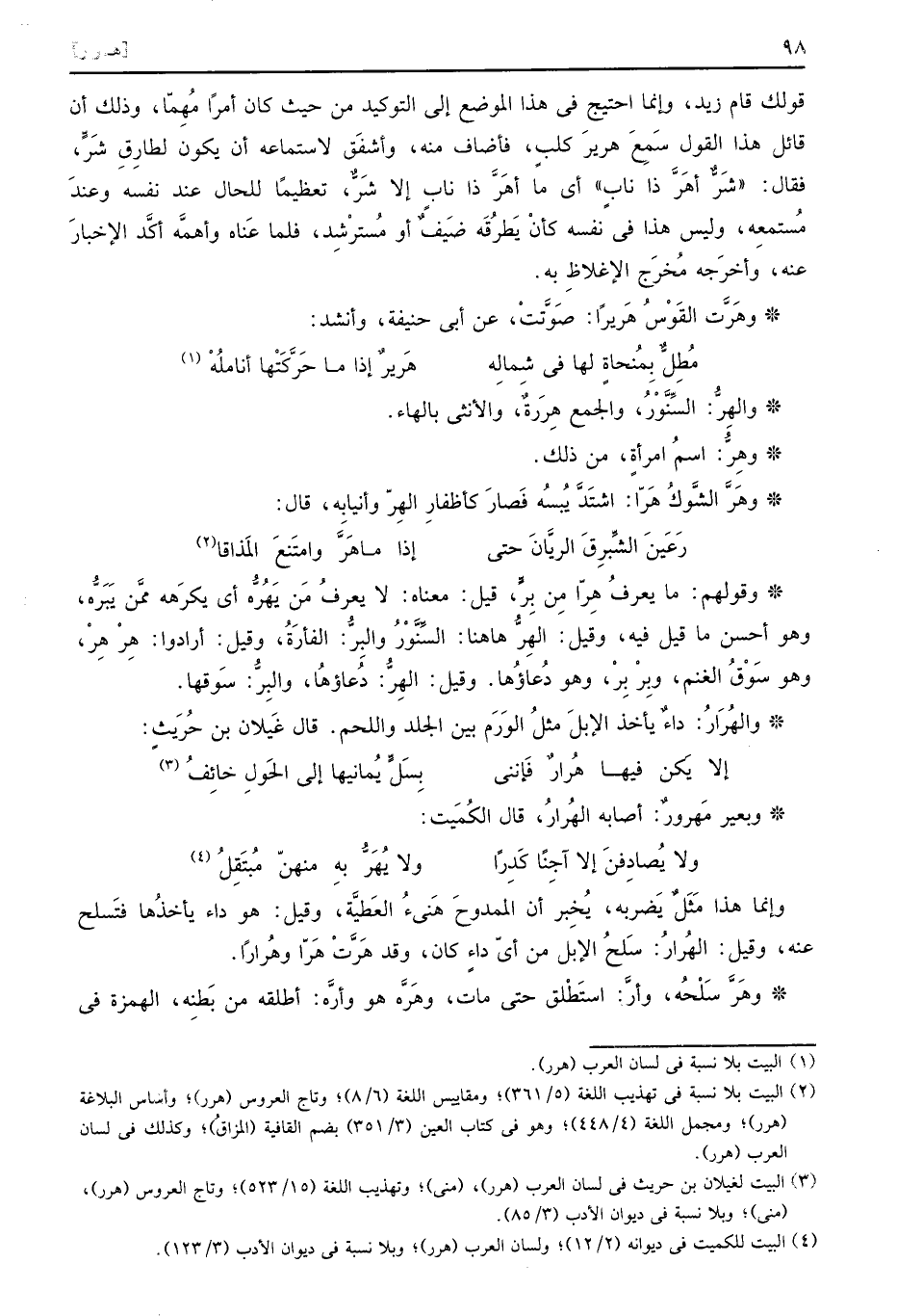 وَقَوْلهمْ: مَا يعرف هِراًّ من بر، قيل: مَعْنَاهُ: لَا يعرف من يهره أَي يكرههُ مِمَّن يبره، وَهُوَ أحسن مَا قيل فِيهِ، وَقيل: الهِرُّ هَاهُنَا: السنور وَالْبر: الْفَأْرَة، وَقيل: أَرَادوا: هِرْهِرْ، وَهُوَ سوق الْغنم، وبربر، وَهُوَ دعاؤها. وَقيل: الهِرُّ: دعاؤها، وَالْبر: سوقها.