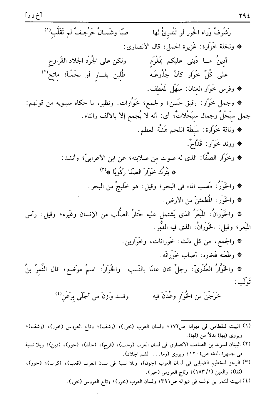 وخَوّار الصَّفَا: الَّذِي لَهُ صَوت من صلابته، عَن ابْن الْأَعرَابِي، وانشد: يَتْرُك خَوّارَ الصّفا رَكُوباً والخَوْرُ: مَصب المَاء فِي الْبَحْر، وَقيل: هُوَ خَليجٌ من الْبَحْر.