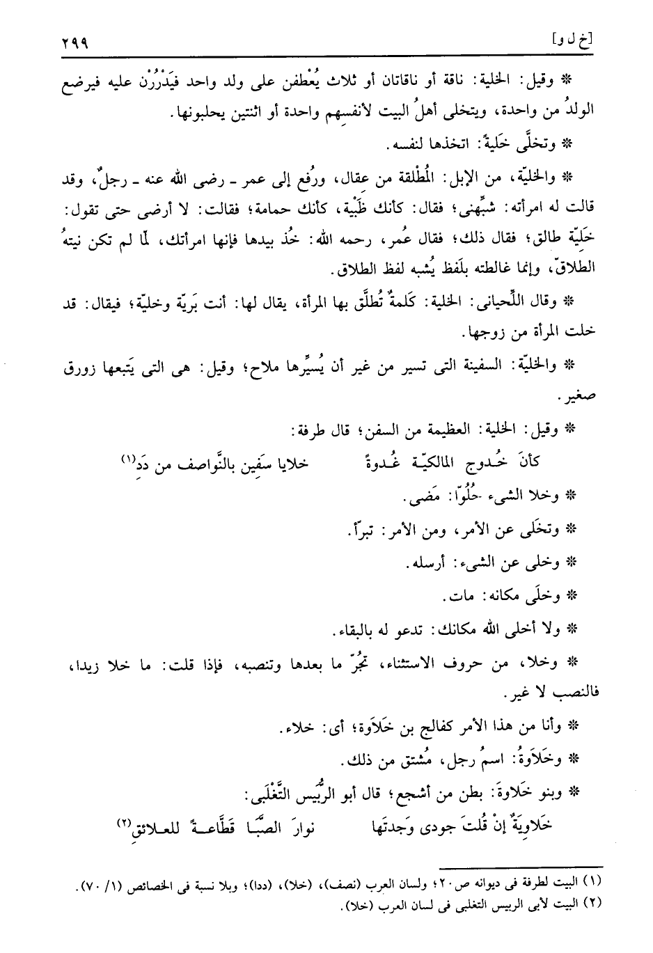 والخليّة، من الْإِبِل: المُطْلقة من عِقال، ورُفع إِلَى عمر. رَضِي الله عَنهُ، رجلٌ، وَقد قَالَت لَهُ امْرَأَته: شبِّهني، فَقَالَ: كَأَنَّك ظَبْية، كَأَنَّك حمامة، فَقَالَت: لَا ارضى حَتَّى تَقول: خَلِيّة طَالِق، فَقَالَ ذَلِك، فَقَالَ عمر، رَحمَه الله: خُذ بِيَدِهَا فَإِنَّهَا امراتك، لمّا لم نَكُنْ نيتهُ الطلاقَ، وَإِنَّمَا غالطته بلَفظ يُشبه لفظ الطَّلَاق.