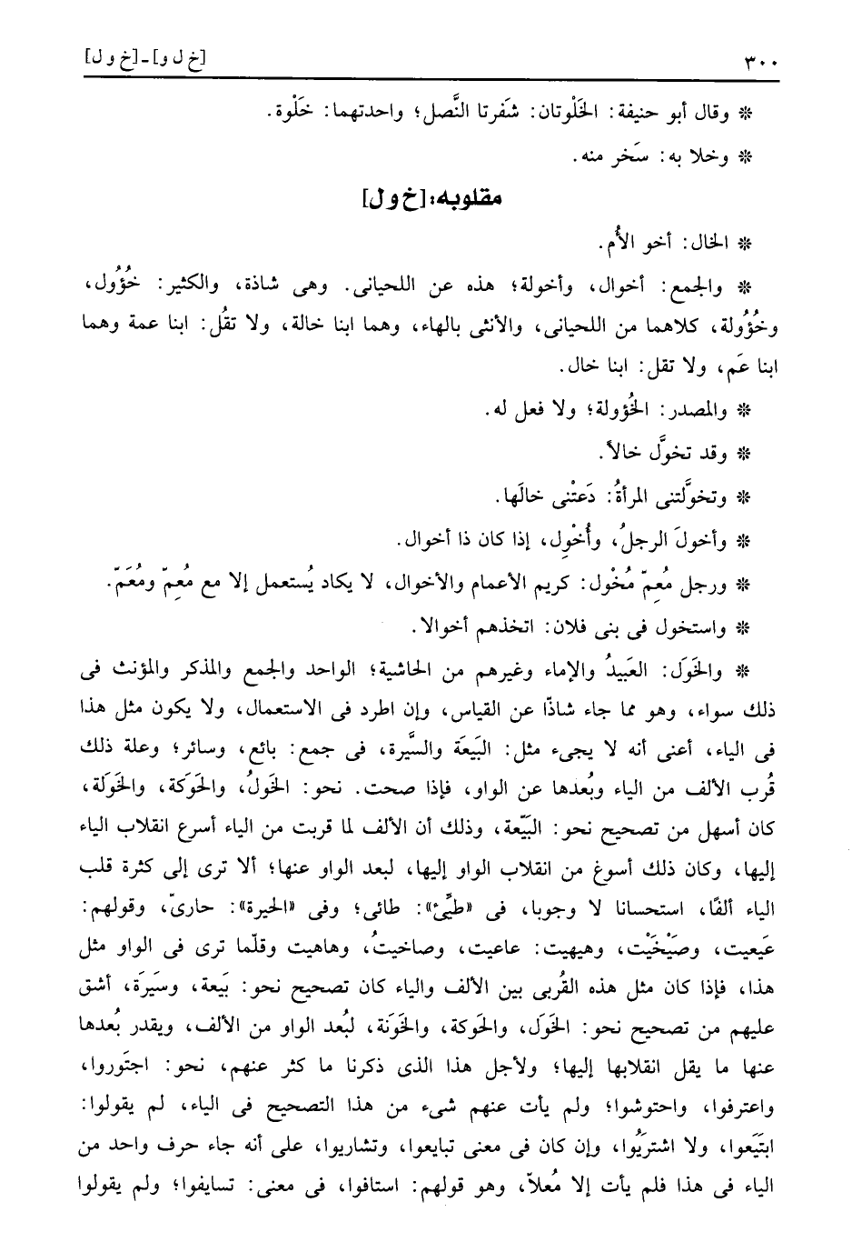 والخَول: العَبيدُ وَالْإِمَاء وَغَيرهم من الْحَاشِيَة، الْوَاحِد وَالْجمع والمذكر والمؤنث فِي ذَلِك سَوَاء، وَهُوَ مِمَّا جَاءَ شاذاً عَن الْقيَاس، وَإِن اطرد فِي الِاسْتِعْمَال، وَلَا يكون مثل هَذَا فِي الْيَاء، اعني انه لَا يَجِيء مثل: البَيعَة والسَّيرّة، فِي جمع: بَائِع، وَسَائِر، وَعلة ذَلِك قُرب الْألف من الْيَاء وبُعدها عَن الْوَاو، فَإِذا صحت. نَحْو: الخَولُ، والحَوَكة، والخَوَلة، كَانَ اسهل من تَصْحِيح نَحْو: البَيّعة، وَذَلِكَ أَن الْألف لما قربت من الْيَاء أسْرع انقلاب الْيَاء إِلَيْهَا، وَكَانَ ذَلِك أسوغ من انقلاب الْوَاو إِلَيْهَا، لبعد الْوَاو عَنْهَا، أَلا ترى إِلَى كَثْرَة قلب الْيَاء الْفَا، اسْتِحْسَانًا لَا وجوبا، فِي " طَيء ": طائي، وَفِي " الْحيرَة ": حاري، وَقَوْلهمْ: عَيعيت، وصَيْخَيْت، وهيهيت: عاعيت، وصاخيتُ، وهاهيت وقلّما ترى فِي الْوَاو مثل هَذَا، فَإِذا كَانَ مثل هَذِه الْقُرْبَى بَين الْألف وَالْيَاء كَانَ تَصْحِيح نَحْو: بَيَعة وسَيرَة، أشق عَلَيْهِم من تَصْحِيح نَحْو: الخَوَل، والحَوكة، والحَوَنة، لبُعد الْوَاو من الْألف، وَيقدر بُعدها عَنْهَا مَا يقل انقلابها إِلَيْهَا، وَلأَجل هَذَا الَّذِي ذكرنَا مَا كثر عَنْهُم، نَحْو: اجتَوروا، واعترفوا، واحتوشوا، وَلم يَأْتِ عَنْهُم شَيْء من هَذَا التَّصْحِيح فِي الْيَاء، لم يَقُولُوا: ابتَيَعوا، وَلَا اشترَيُوا، وَإِن كَانَ فِي معنى تبايعوا، وتشاريو، على انه جَاءَ حرف وَاحِد من الْيَاء فِي هَذَا فَلم يات إِلَّا مُعلاًّ، وَهُوَ قَوْلهم، استافوا، فِي معنى: تسايفوا، وَلم يَقُولُوا