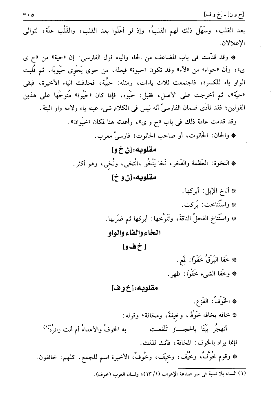 وَقد قدّمت فِي بَاب المضاعف من الْحَاء وَالْيَاء قَول الْفَارِسِي: إِن " حَيَّة " من " ح ي ي "، وَأَن " حَوَّاء " من " لاء " وَقد تكون " حَيْوَة " فيعلة، من حوى يَحْوِي حَيْويَة، ثمَّ قُلبت الْوَاو يَاء للكسرة، فاجتمعت ثَلَاث ياآت، وَمثله: حيَّيِة، فحذفت الْيَاء الاخيرة، فَبَقيَ " حَيَّة " ثمَّ أخرجت على الأَصْل، فَقيل: حَيْوَة، فَإِذا كَانَ " حَيْوة " مُتوجِّها على هذَيْن الْقَوْلَيْنِ، فقد تادى ضَمَان الْفَارِسِي أَنه لَيْسَ فِي الْكَلَام شَيْء عينه يَاء ولامه وَاو الْبَتَّةَ.