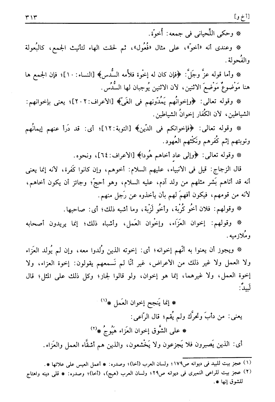 وَيجوز أَن يعنوا بِهِ أنّهم إخوانه، أَي: إخْوَته الَّذين وُلدوا مَعَه، وَإِن لم يُولد العَزاء وَلَا الْعَمَل وَلَا غير ذَلِك من الْأَغْرَاض، غير أَنا لم نَسمعهم يَقُولُونَ: إخْوَة العزاء، وَلَا إخْوَة العَمل، وَلَا غَيرهمَا، إِنَّمَا هُوَ إخْوَان، وَلَو قَالُوا لجَاز، وكل ذَلِك على الْمثل، قَالَ لَبيدٌ: إِنَّمَا يَنجح إخْوَان العَمل يَعْنِي: من دأبَ وتحرَّك وَلم يُقم، قَالَ الرّاعي:
