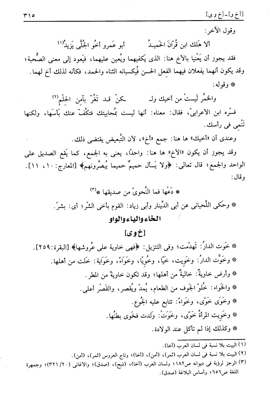 وَقَالَ: دَعْها فَمَا النَّحوىّ من صديقها وَحكى اللِّحياني، عَن أبي الدِّينار، وَأبي زِيَاد: الْقَوْم بأخي الشّر، أَي: بشرّ.