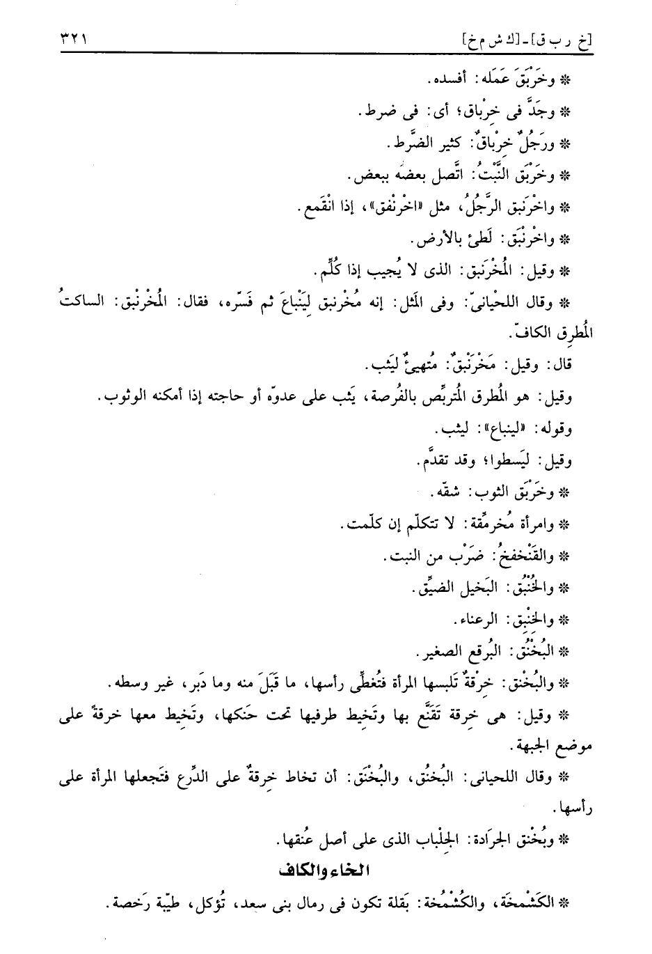 وَقَالَ اللحياني: البُخنُق، والبُخْنَق: أَن تخاط خِرقةٌ على الدرْع فتَجعلها الْمَرْأَة على رَأسهَا.