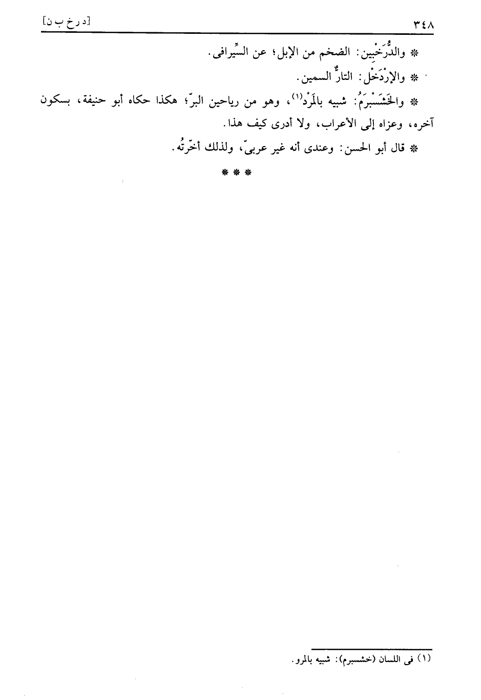 والخَشَسْبَرمُ: شَبيه بالمَرْد، وَهُوَ من رياحين البرّ، هَكَذَا حَكَاهُ أَبُو حنيفَة، بِسُكُون آخِره، وَعَزاهُ إِلَى الْأَعْرَاب، وَلَا ادري كَيفَ هَذَا؟ وَقَالَ أَبُو الْحسن: وَعِنْدِي انه غير عَرَبِيّ، وَلذَلِك اخّرتُه.