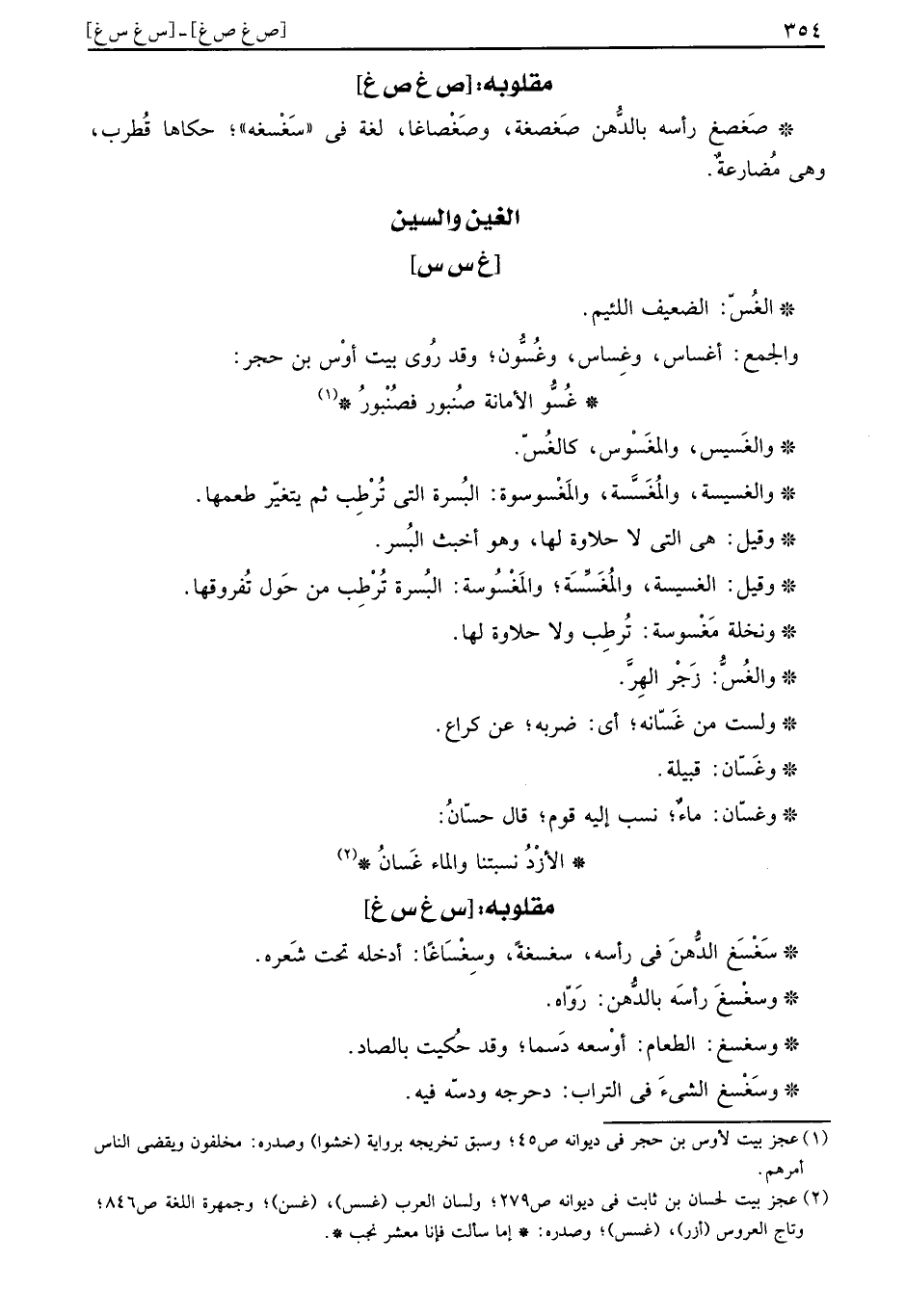وَالْجمع: أغساس، وغِساس، وغُسُّون، وَقد رُوى بَيت أوْس بن حجر: غُسُّو الْأَمَانَة صُنبور فصُنْبورُ والغَسيس، والمغَسْوس، كالغُسّ والغسيسة، والمُغَسَّسة، والمَغْسوسة: البُسرة الَّتِي تُرْطِب ثمَّ يتغيَّر طعمها.