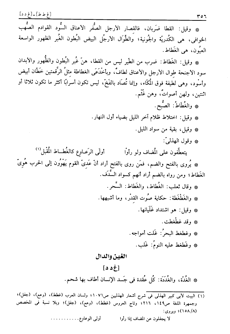 وَقيل: الغَطاط: ضرب من الطّير لَيْسَ من القطا، هنّ غبُر البُطون والظُّهور والأبدان سود الأجنحة طِوال الأرجل والأعناق لطافٌ، وبأخْدَعَي الغطاطة مِثلُ الرَّقمتين خَطّان ابيض واسْود، وَهِي لَطِيفَة فَوق المُكّاء، وَإِنَّمَا تُصَاد بالفخ، لَيْسَ تكون اسرابا، اكثر مَا تكون ثَلَاثًا أَو اثْنَتَيْنِ، ولهن اصواتٌ، وَهن غُتْم.