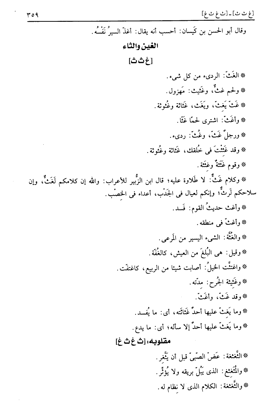 وَكَلَام غَثُّ: لَا طَلاوة عَلَيْهِ، قَالَ ابْن الزُّبير للاعراب: وَالله إِن كلامكم لَغَثُّ، وَإِن سلاحكم لَرثُّ، وَإِنَّكُمْ لعيال فِي الجَدْب، أَعدَاء فِي الخِصْب.