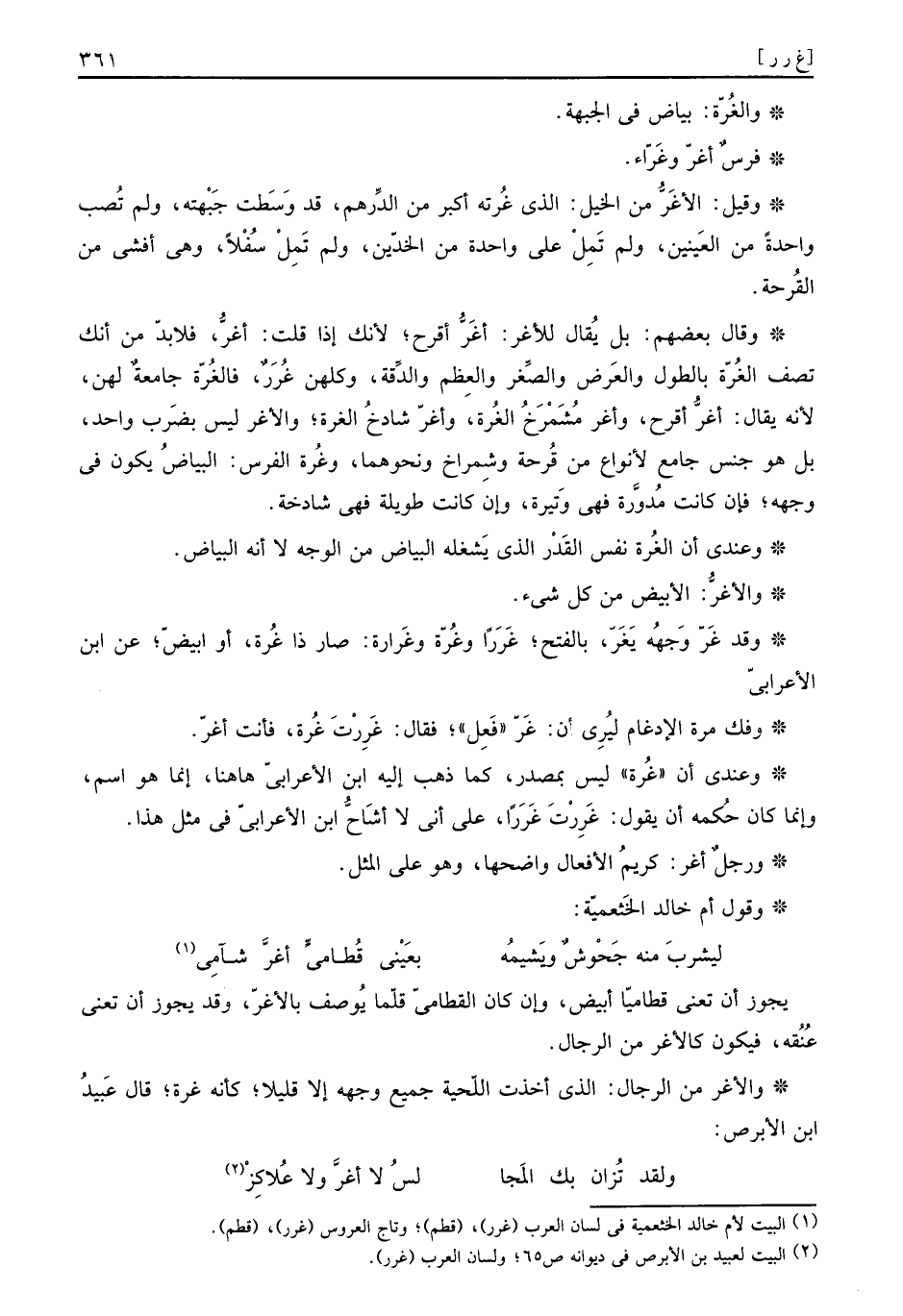 والاغر من الرِّجَال: الَّذِي أخذت اللِّحْيَة جَمِيع وَجهه إِلَّا قَلِيلا، كَأَنَّهُ غرَّة، قَالَ عَبيد بُن الابرص: