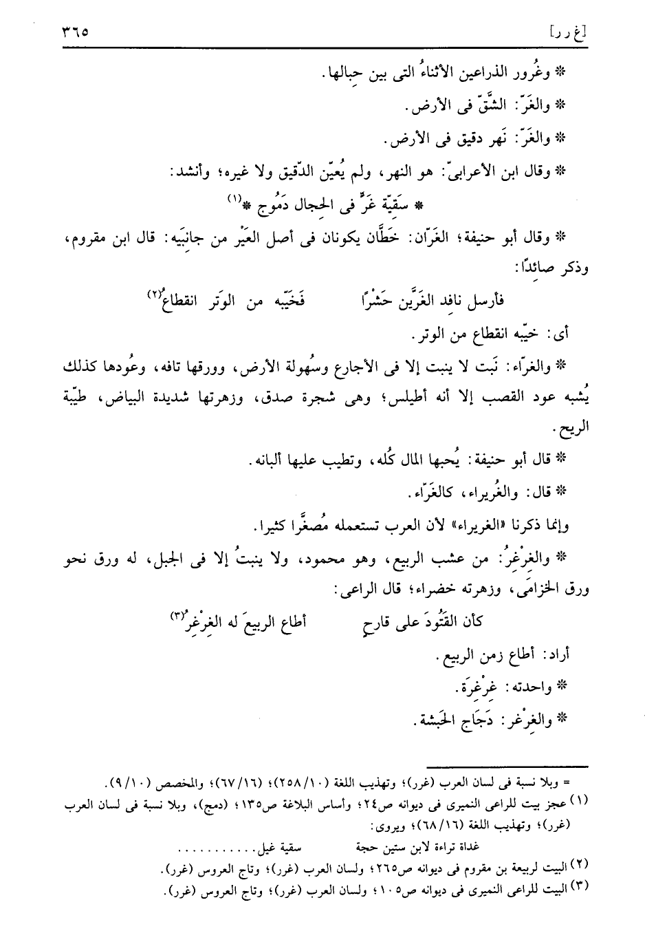 وَقَالَ ابْن الْأَعرَابِي: هُوَ النَّهر، وَلم يُعيّن الدَّقِيق وَلَا غَيره، وانشد: سَقِيّة غَرٍّ فِي الحِجال دُمُوج وَقَالَ أَبُو حنيفَة، الغَرّان: خَطَّان يكونَانِ فِي اصل العَيْر من جانِبَيه: قَالَ ابْن مقروم، وَذكر صائَداً: