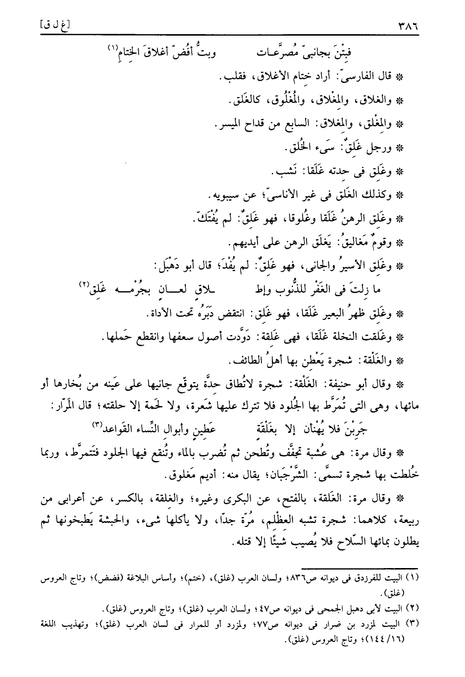 قَالَ الفارسيّ: أَرَادَ خِتام الأغلاق، فَقلب والغلاَق، والمِغْلاَق، والمُغْلُوق، كالغَلق والمِغْلق، والمِغلاق: السَّابِع من قداح الميسر وَرجل غَلِقٌ: سَيئ الخُلق.