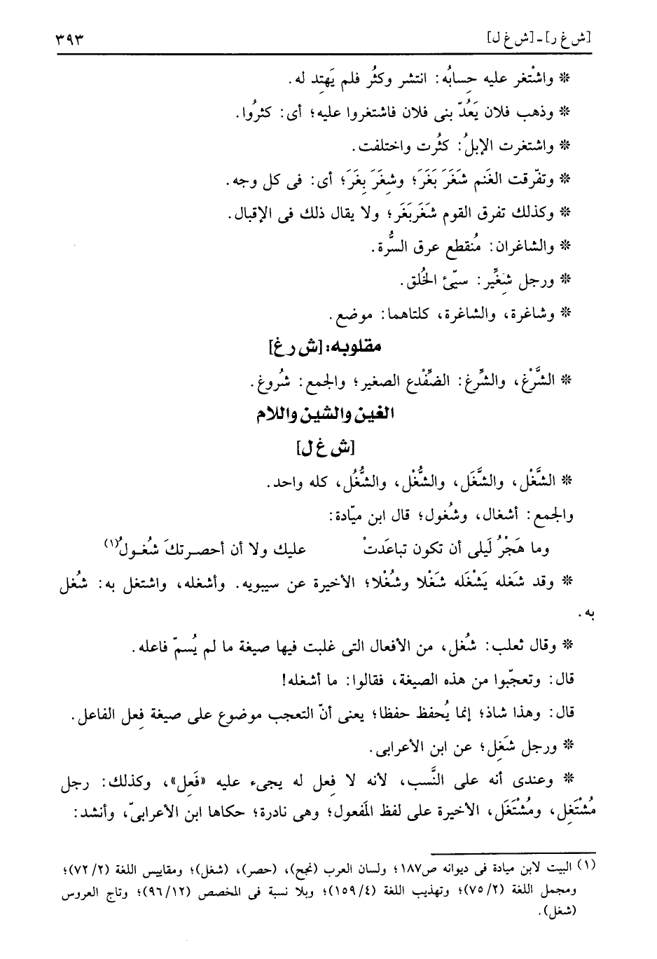 وَالْجمع: أشغال، وشُغول، قَالَ ابْن ميّادة: