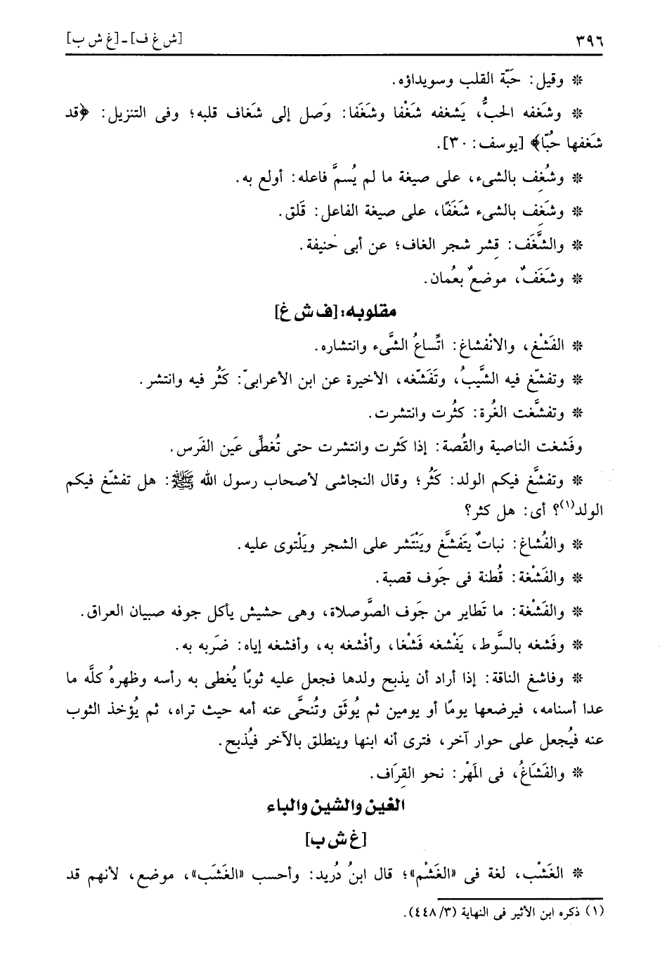 وتفشّغ فِيهِ الشَّيُب، وتَفَشّغه، الْأَخِيرَة عَن ابْن الْأَعرَابِي: كَثُر فِيهِ وانتشر.