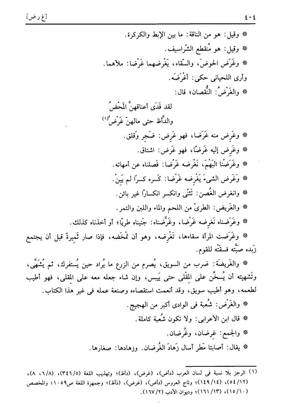 والغَريضَة: ضرب من السويق، يُصرم من الزَّرْع مَا يُراد حِين يُستفزك، ثمَّ يُشَهَّى، وتَشتهيه أَن يُسخَّن على المِقلى حَتَّى ييبس، وَإِن شَاءَ جعله مَعَه على المقلى، فَهُوَ أطيب لطعمه، وَهُوَ أطيب سويق. وَقد انعمت استقصاه وصنعة عمله فِي غير هَذَا الْكتاب.