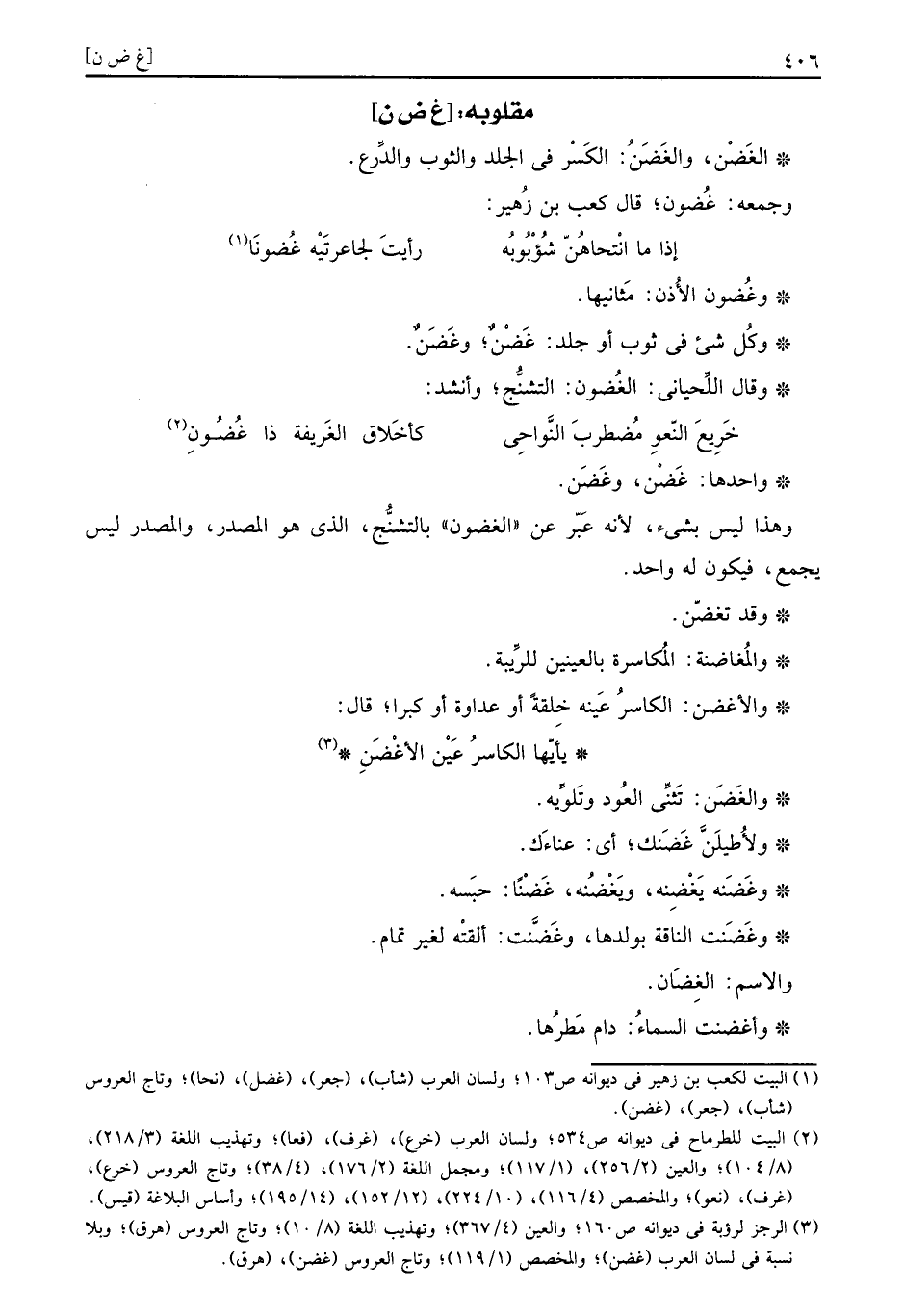 والأغضن: الكاسرُ عَينه خِلقةً أَو عَدَاوَة أَو كبْرا، قَالَ: يأيّها الكاسرُ عَيْن الأغْضَنِ والغَضَن: تَثنيِّ العُود وتَلوِّيه.