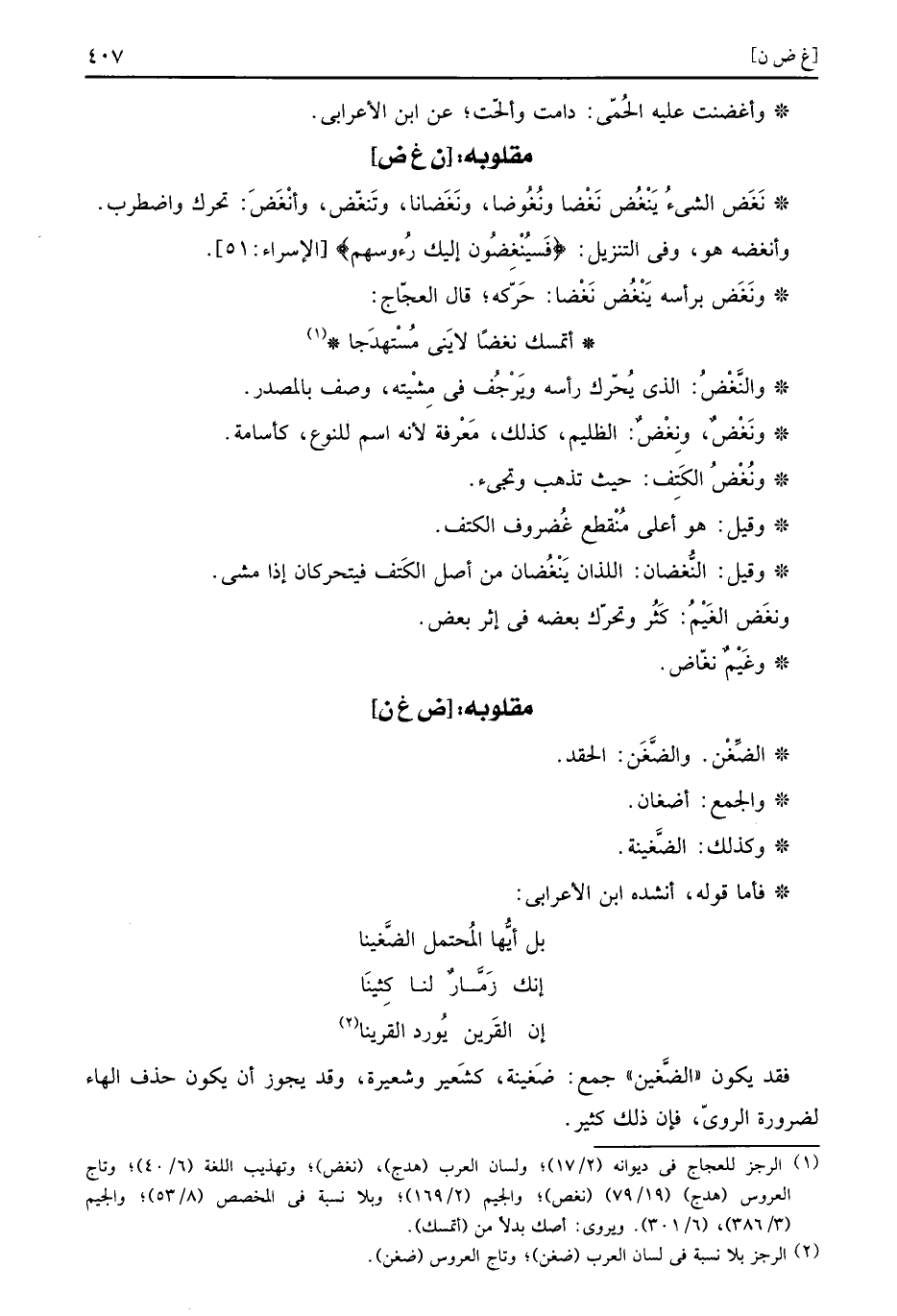 فَأَما قَوْله، انشده ابْن الْأَعرَابِي: بل أيُّها المُحتمل الضَّغينا إِنَّك زَمَّارٌ لنا كِثينَا إِن القَرين يُورد القرينا فقد يكون " الضَّغين " جمع: ضَغينة، كشَعير وشعيرة، وَقد يجوز أَن يكون حذف الْهَاء لضَرُورَة الروى، فَإِن ذَلِك كثير.