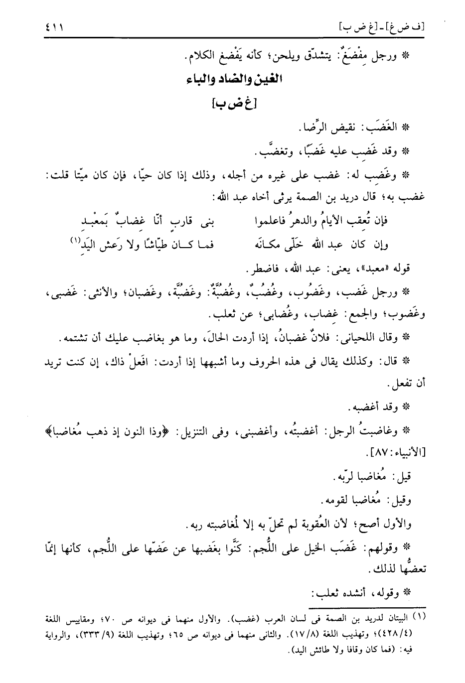 وغَضب لَهُ: غضب على غَيره من اجله، وَذَلِكَ إِذا كَانَ حيًّا، فَإِن كَانَ ميّتا قلت: غضب بِهِ، قَالَ دُرَيْد بن الصمَّة يرثي اخاه عبد الله: