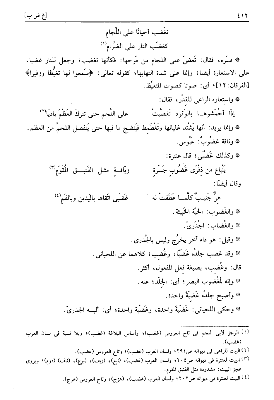 فسره، فَقَالَ: تَعض على اللجام من مرحها: فكانها تغْضب، وَجعل للنار غَضبا، على الِاسْتِعَارَة أَيْضا، وَإِنَّمَا عَنى شدَّة التهابها، كَقَوْلِه تَعَالَى: (سَمعوا لَهَا تغيُّظا وزفيرا) ، أَي: صَوتا كصوت المتغيِّظ.