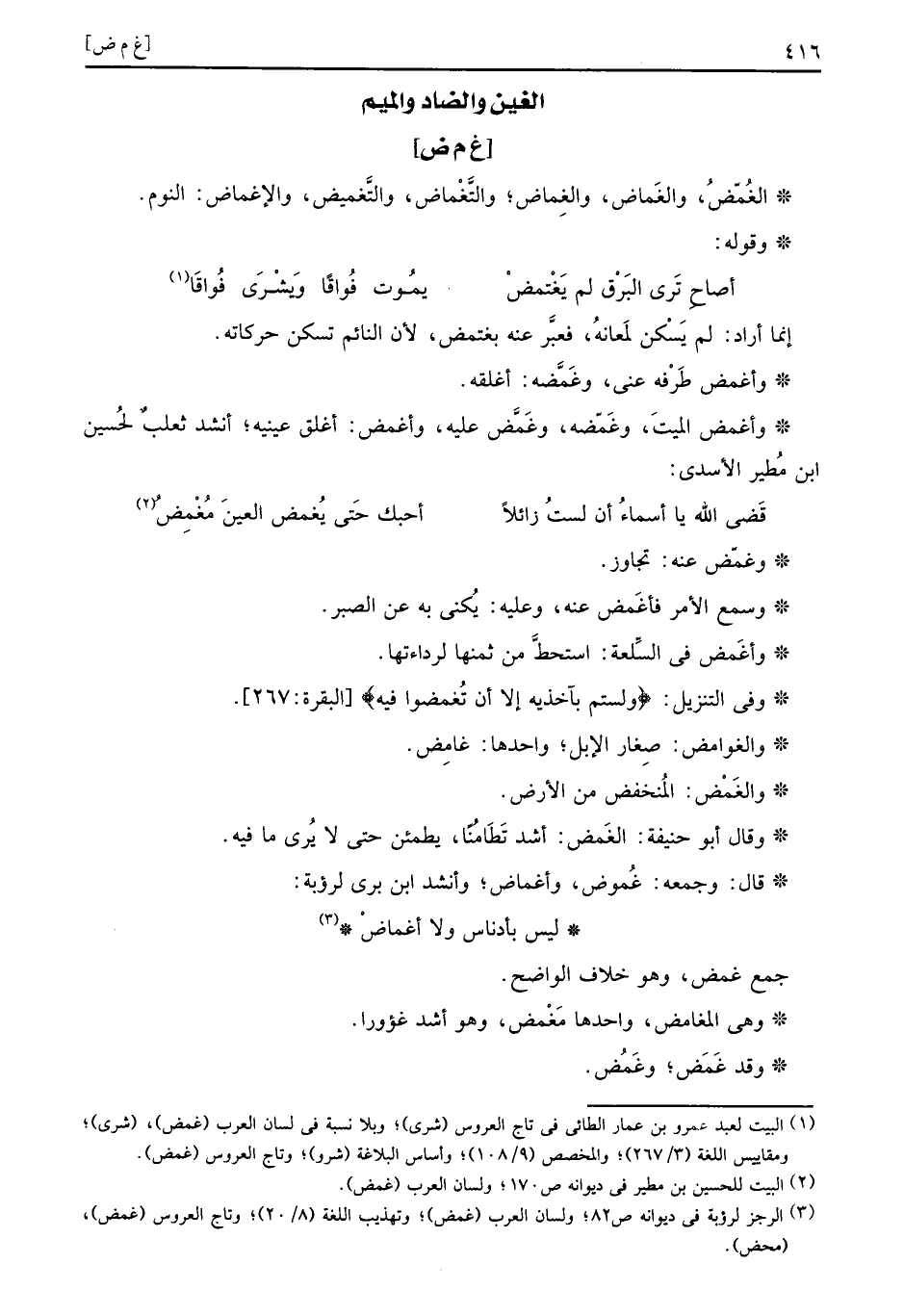 الغُمّضُ، والغَماض، والغِماض، والتَّغْماض، والتَّغميض، والإغماض: النّوم.