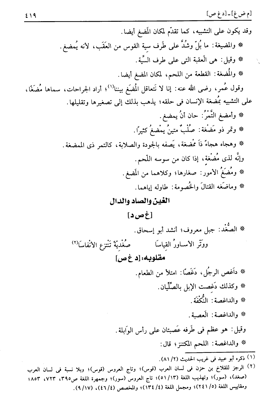 والمُضغة: الْقطعَة من اللَّحْم، لمَكَان المضغ أَيْضا. وَقَول عُمر، رَضِي الله عَنهُ: إِنَّا لَا نَتعاقل المُضَغ بَيْننَا، أَرَادَ الْجِرَاحَات، سَمَّاهَا مُضَغاً، على التَّشْبِيه بمُضغة الْإِنْسَان فِي حلقه، يذهب بذلك إِلَى تصغيرها وتقليلها.