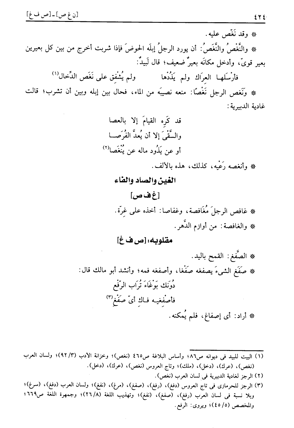 ونَغص الرجل نَغْصاً: مَنعه نصيبَه من المَاء، فحال بَين إبِله وَبَين أَن تشرب، قَالَت غادية الدبيرية: قد كَرِه القيامَ إِلَّا بالعصا والسَّقْيَ إِلَّا أَن يُعدَّ الفُرَصا أَو عَن يَذُود مَاله عَن يُنْغَصا وانغصه رَعْيه، كَذَلِك، هَذِه بِالْألف.