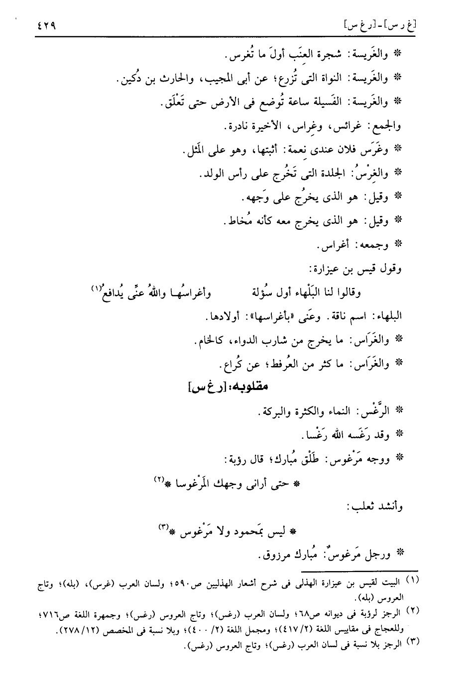 وَوجه مَرْغوس: طَلْق مُبارك، قَالَ رؤبة: حَتَّى أَرَانِي وَجهك المَرْغوسا وانشد ثَعْلَب: لَيْسَ بمَحمود وَلَا مَرْغوس وَرجل مَرغوسٌ: مُبارك مَرْزُوق.