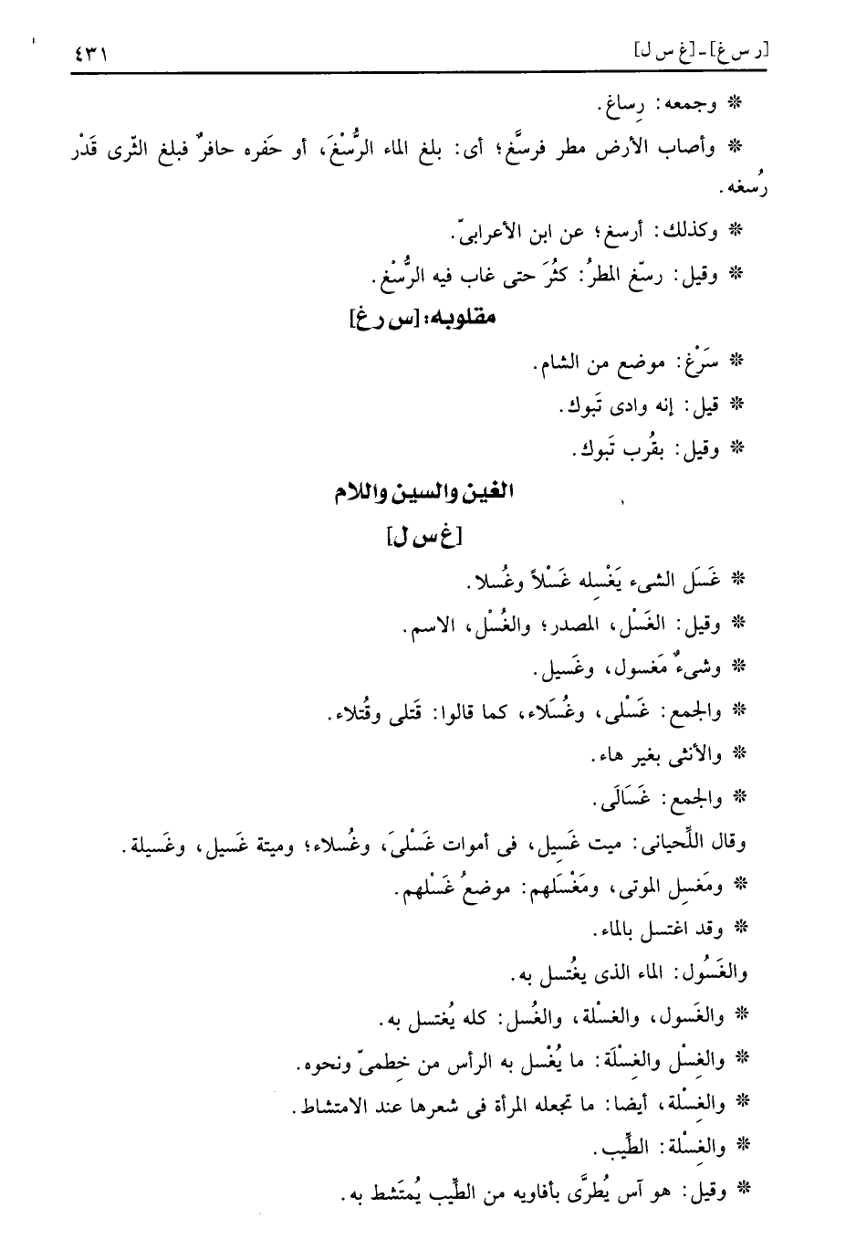 وَقَالَ اللَّحياني: ميت غَسِيل، فِي أموات غَسْلىَ، وغُسلاء، وميتة غَسيل، وغَسيلة.