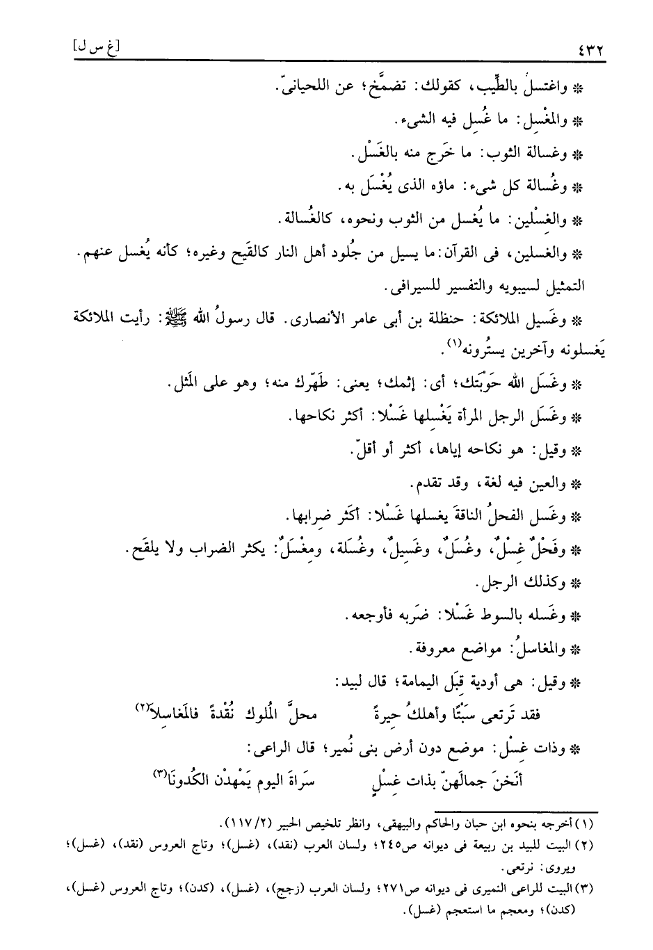 والغسلين، فِي الْقُرْآن: مَا يسيل من جُلود أهل النَّار، كالقَيح وَغَيره، كَأَنَّهُ يُغسل عَنْهُم.