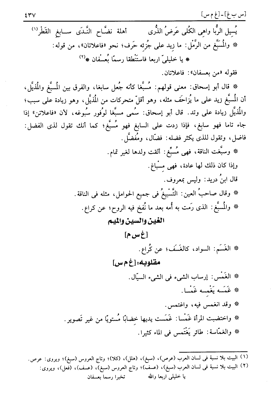 والمُسَبَّغ من الرَّمْل: مَا زِيد على جُزئِه حَرف، نَحْو " فاعلاتان "، من قَوْله: يَا خليلي اربعا فاستَنْطقا رسماً بُعسْفان