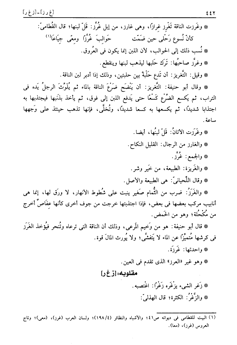 وغَرزت النَّاقة تَغْرِز غِرازاً، وَهِي غارز، من إبل غُرَّز: قل لَبنهَا، قَالَ القُطامي: