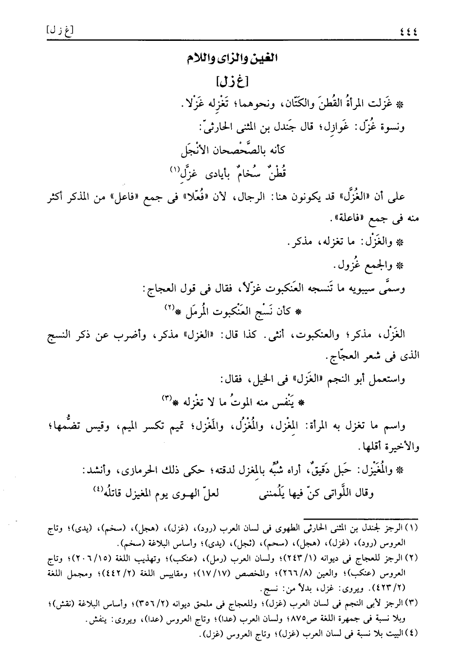 وَاسْتعْمل أَبُو النَّجْم " الغَزل " فِي الْخَيل، فَقَالَ: يَنْفس مِنْهُ الموتُ مَا لَا تغْزله وَاسم مَا تغزل بِهِ الْمَرْأَة: المِغْزل، والمُغْزُل، والمَغْزل، تَمِيم تكسر الْمِيم وَقيس تضُّمها، والأخيرة اقلها.