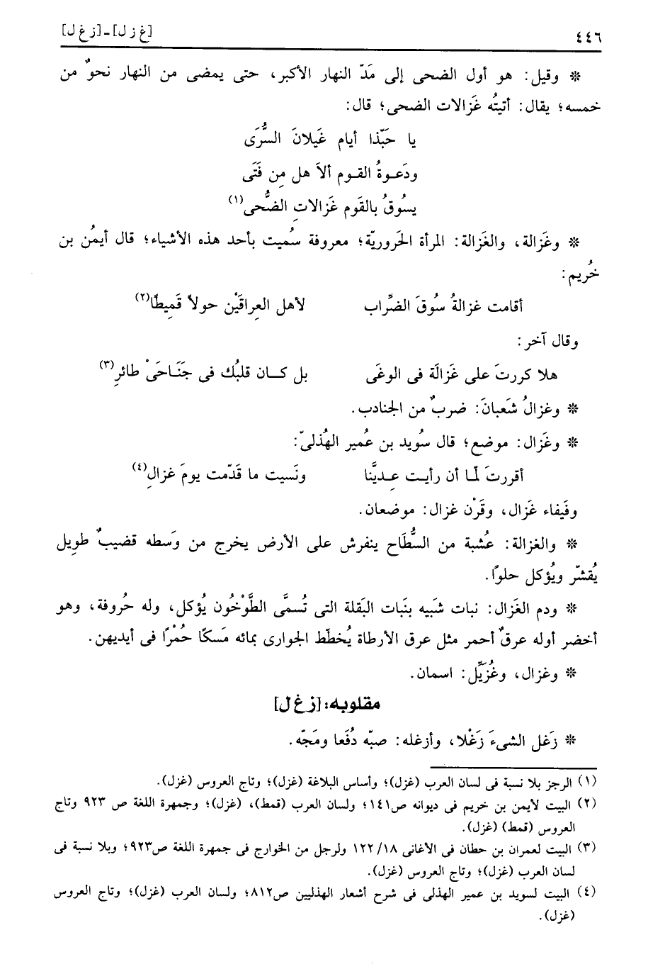 يسُوقُ بالقَوم غَزالاتِ الضُّحى وغَزالة والغَزالة: الْمَرْأَة الحَروريّة، مَعْرُوفَة سُميت باحد هَذِه الْأَشْيَاء، قَالَ أيمُن بن خُريم: