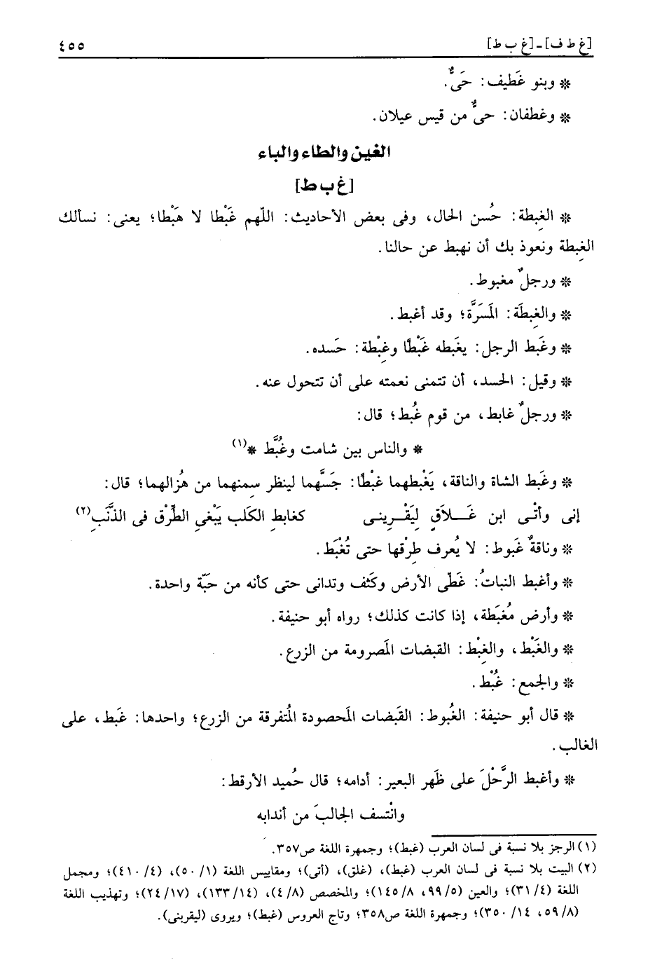 ورجلٌ غابط، من قوم غُبط، قَالَ: وَالنَّاس بَين شامت وغُبَّط وغَبط الشَّاة والناقة، يَغْبطهما غبْطاً: جَسَّهما لينْظر سِمنهما من هُزالهما، قَالَ: