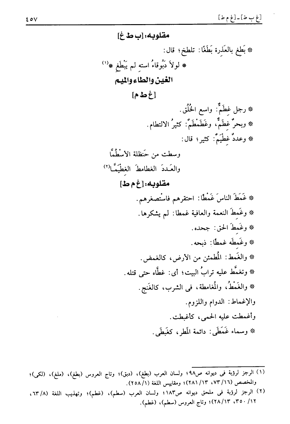 بَطِغ بالعَذرِة بَطَغاً: تلطخ، قَالَ: لَولاَ دَبُوقاءُ استهِ لم يَبْطَغِ
