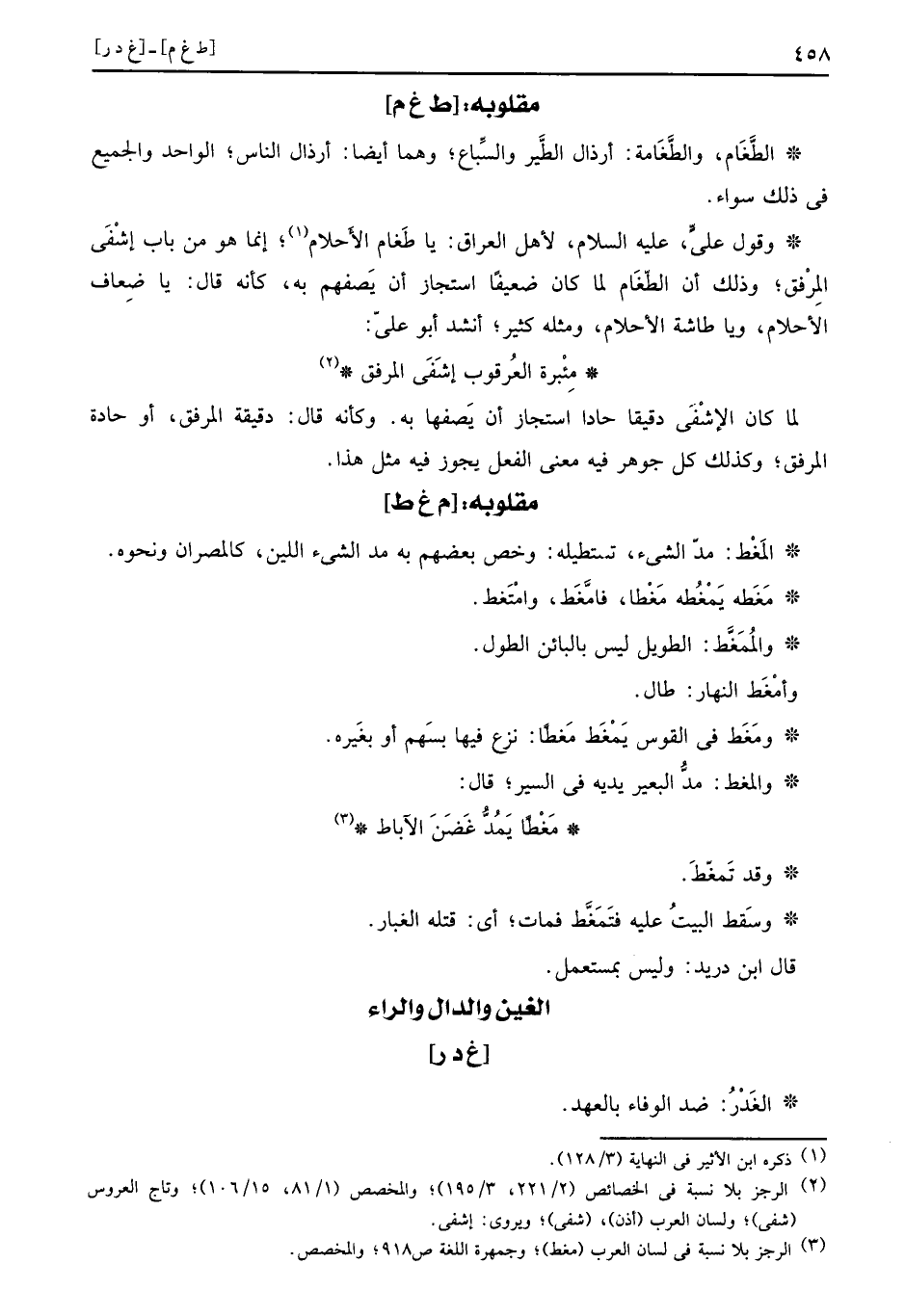 وَقَول عَليّ، عَلَيْهِ السَّلَام، لأهل الْعرَاق: يَا طَغام الأحلام، إِنَّمَا هُوَ من بَاب إشْفَى المِرْفق، وَذَلِكَ أَن الطّغَام لما كَانَ ضَعِيفا استجاز أَن يَصفهم بِهِ، كَأَنَّهُ قَالَ: يَا ضِعَاف الأحلام، وَيَا طاشة الأحلام، وَمثله كثير، انشد أَبُو عَليّ: مِئْبرة العُرقوب إشَقَى الْمرْفق لما كَانَ الإشْفَى دَقِيقًا حادا استجاز أَن يَصفها بِهِ وَكَأَنَّهُ قَالَ: دقيقة الْمرْفق، أَو حادة الْمرْفق، وَكَذَلِكَ كل جَوْهَر فِيهِ معنى الْفِعْل يجوز فِيهِ مثل هَذَا.