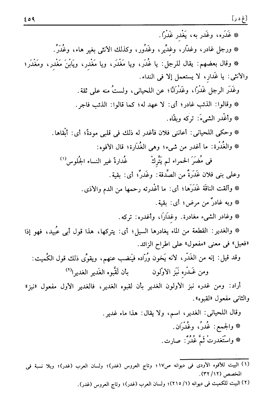 وغَدَر الرجل غَدْراً، وغَدْرَاناً، عَن اللحياني، ولستُ مِنْهُ على ثِقَة.