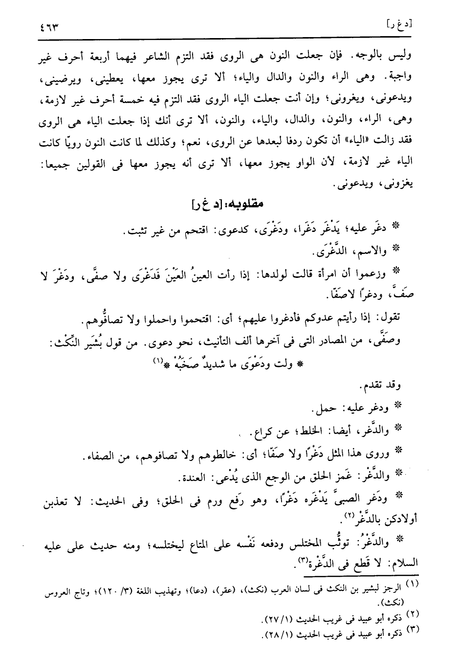 وصَفَّى، من المصادر الَّتِي فِي آخرهَا ألف التَّأْنِيث، نَحْو دَعْوَى. من قَول بُشَير النَّكْث: ولت ودَعْوَى مَا شديدٌ صَخَبُهْ وَقد تقدم ودغر عَلَيْهِ: حمل.