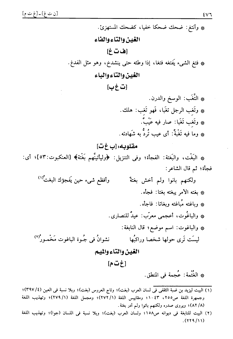 البَغْت، والبَغْتة: الْفجأَة، وَفِي التَّنْزِيل: (وليأتينَّهم بَغْتة) ، أَي: فَجْأَة، ثمَّ قَالَ الشَّاعِر: