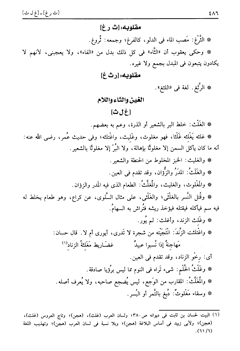 والمَغْلوث، والغليث، والمُغلَّثُ: الطَّعَام الَّذِي فِيهِ المَدر والزؤان.