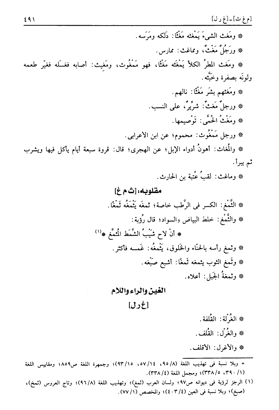 والثَّمْغ: خلط الْبيَاض والسواد، قَالَ رُؤبة: أَن لَاحَ شَيْبُ الشَّمَط المُثمَّغ