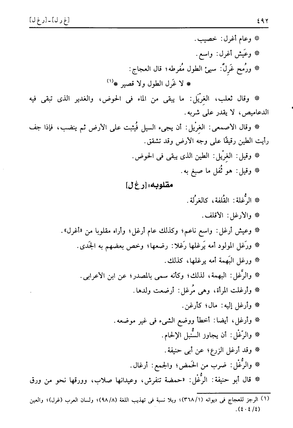وعيش ارغل: وَاسع ناعم، وَكَذَلِكَ عَام أرغ، وَأرَاهُ مقلوبا من " أغرل ".